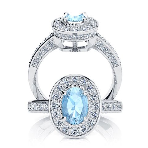 1 1/2 Carat Oval Shape Aquamarine and Halo Diamond Ring In 14 Karat White Gold