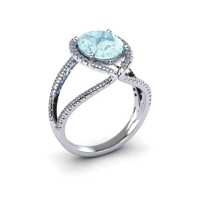 Retrograde Birthstones™ 1 1/2 Carat Oval Shape Aquamarine and Halo Diamond Ring In 14 Karat White Gold