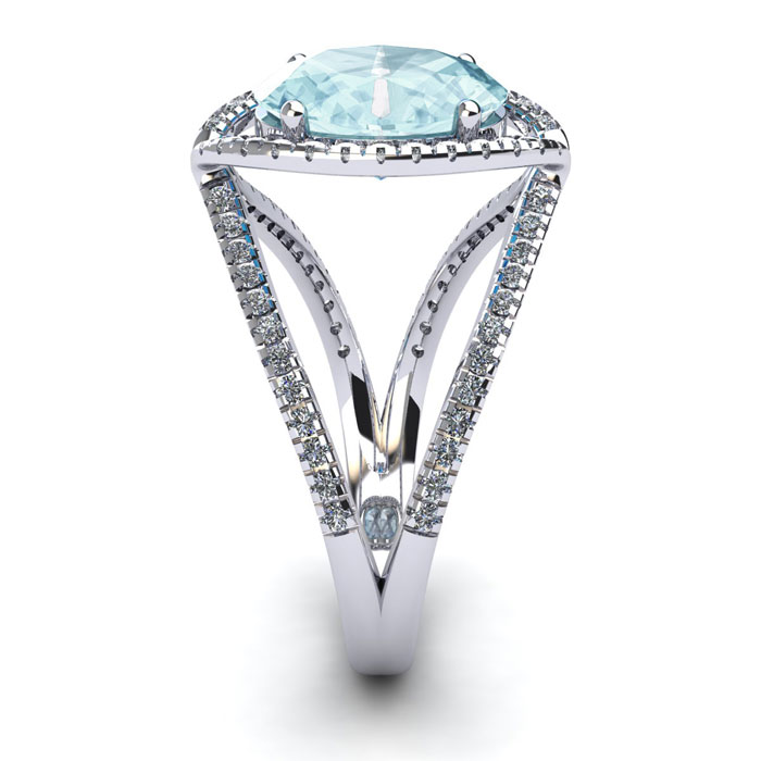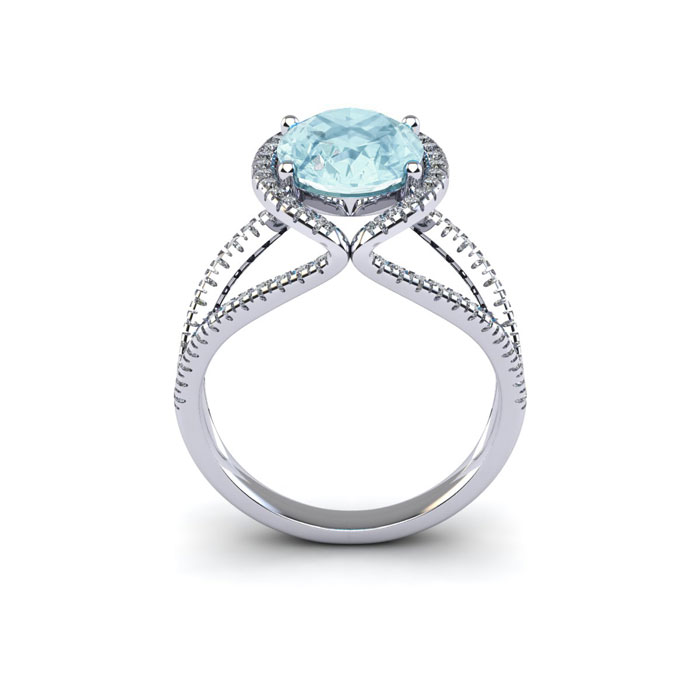 This stunning gemstone and halo diamond ring features one 8x6mm oval shape aquamarine gemstone at 1.15 carats. It is surrounded by 86 sparkling diamonds in a halo and down the split shank band in H-I color, I1-I2 clarity at 0.43 carats. Total gem weight is 1.58 carats. This ring is crafted in 14 karat white gold. *Retrograde Birthstones™ flips the idea of traditional birthstones. Wear your ½ birthday birthstone, your Retrograde Birthstone, “The Birthstone For Your Bad Side™.