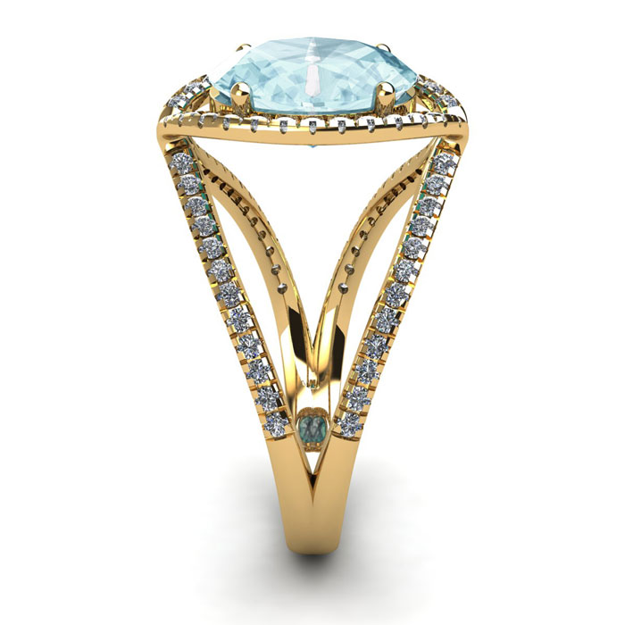 This stunning gemstone and halo diamond ring features one 8x6mm oval shape aquamarine gemstone at 1.15 carats. It is surrounded by 86 sparkling diamonds in a halo and down the split shank band in H-I color, I1-I2 clarity at 0.43 carats. Total gem weight is 1.58 carats. This ring is crafted in 14 karat yellow gold.
