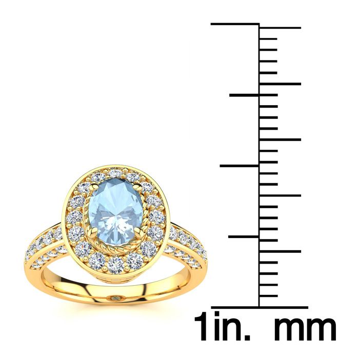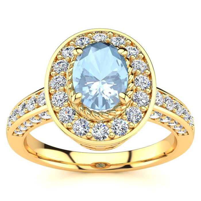 1 1/2 Carat Oval Shape Aquamarine and Halo Diamond Ring In 14 Karat Yellow Gold