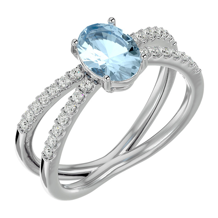 This aquamarine ring features one 8x6mm oval shape aquamarine gemstone. It is surrounded by 28 sparkling diamonds totaling 1/4 carat in I-J color, I1-I2 clarity. Total carat weight is approximately 1 1/2 carats. This ring is in sterling silver.