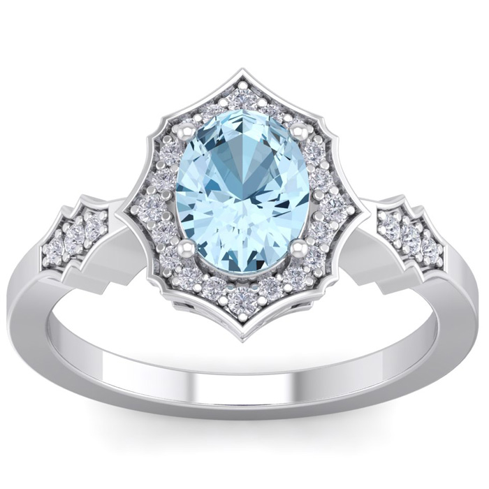 This aquamarine ring features one 8x6mm oval shape aquamarine gemstone. It is surrounded by 26 sparkling diamonds totaling 1/4 carat in I-J color, I1-I2 clarity. Total carat weight is approximately 1 1/2 carats. This ring is in sterling silver. *Retrograde Birthstones™ flips the idea of traditional birthstones. Wear your ½ birthday birthstone, your Retrograde Birthstone, “The Birthstone For Your Bad Side™.