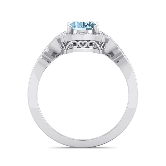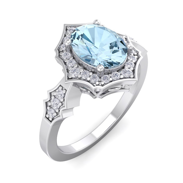 Retrograde Birthstones™ 1 1/2 Carat Oval Shape Aquamarine and Halo Diamond Ring In Sterling Silver