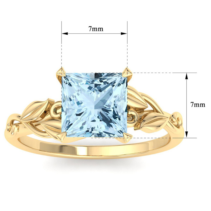 This gemstone ring features one 7mm princess shape aquamarine gemstone weighing approximately 1 1/2 carats. This ring is in 14 karat yellow gold.