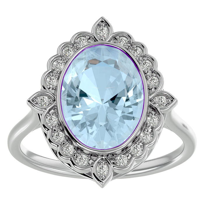 Retrograde Birthstones™ 1 1/3 Carat Oval Shape Aquamarine and Halo Diamond Ring In 14 Karat White Gold