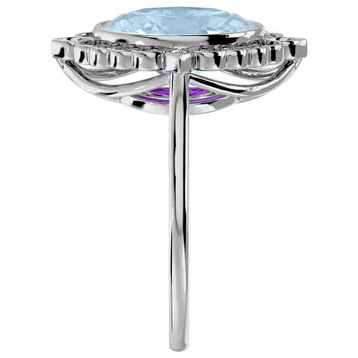 This elegant gemstone ring features one 8x6mm oval shape aquamarine gemstone at approximately 1.15 carats. It is surrounded by 20 sparkling diamonds in I-J color, I1-I2 clarity at 1/5 carat total weight. Total gem weight is approximately 1 1/3 carats. This ring is in 14 karat white gold. *Retrograde Birthstones™ flips the idea of traditional birthstones. Wear your ½ birthday birthstone, your Retrograde Birthstone, “The Birthstone For Your Bad Side™.