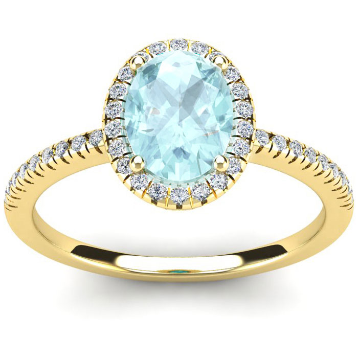 This stunning gemstone and halo diamond ring features one 8x6mm oval shape aquamarine gemstone at 1.15 carats. It is surrounded by 40 sparkling diamonds in a halo and down the band in I-J color, I1-I2 clarity at 0.20 carats. Total gem weight is 1.35 carats. This ring is crafted in 14 karat yellow gold.