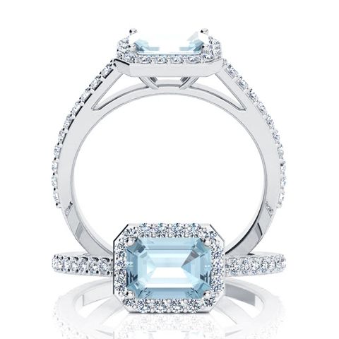 This stunning gemstone and halo diamond ring features one 7x5mm emerald shape aquamarine gemstone at 0.90 carats. It is surrounded by 42 sparkling diamonds in a halo and down the band in H-I color, I1-I2 clarity at 0.31 carats. Total gem weight is 1.21 carats. This ring is crafted in 14 karat white gold.