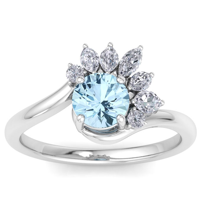 This gemstone ring features one 6mm round aquamarine gemstone weighing approximately 1 carat. There are 7 sparkling marquise and round diamonds in I-J color, I1-I2 clarity totaling approximately 1/4 carat. Total carat weight is 1 1/4 carats. This ring is in 14 karat white gold.