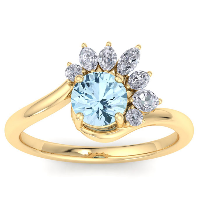 This gemstone ring features one 6mm round aquamarine gemstone weighing approximately 1 carat. There are 7 sparkling marquise and round diamonds in I-J color, I1-I2 clarity totaling approximately 1/4 carat. Total carat weight is 1 1/4 carats. This ring is in 14 karat yellow gold.