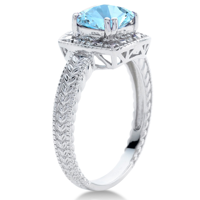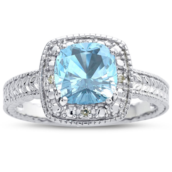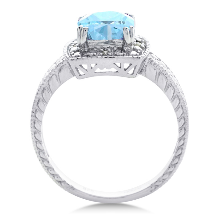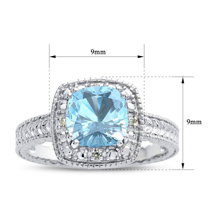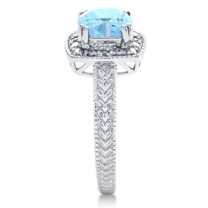 This aquamarine ring features one 7x7mm cushion shape aquamarine gemstone. It is surrounded by 4 sparkling diamonds totaling 0.02 carats in I-J color, I1-I2 clarity. Total carat weight is approximately 1 1/4 carats. This ring is in sterling silver.