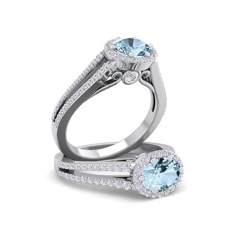 This stunning gemstone and halo diamond ring features one 7x5mm oval shape aquamarine gemstone at 0.80 carats. It is surrounded by 70 sparkling diamonds in a halo and down the band in H-I color, I1-I2 clarity at 0.41 carats. Total gem weight is 1.21 carats. This ring is crafted in 14 karat white gold.