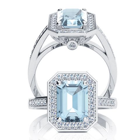 This stunning gemstone and halo diamond ring features one 8x6mm emerald shape aquamarine gemstone at 1.40 carats. It is surrounded by 38 sparkling diamonds in a halo and down the band in I-J color, SI2-I1 clarity at 0.39 carats. Total gem weight is 1.79 carats. This ring is crafted in 14 karat white gold.
