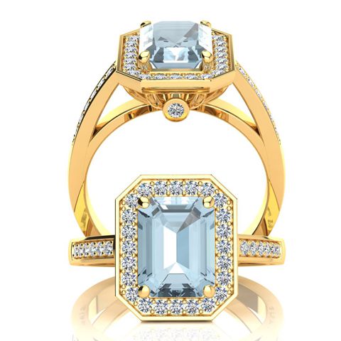 This stunning gemstone and halo diamond ring features one 8x6mm emerald shape aquamarine gemstone at 1.40 carats. It is surrounded by 38 sparkling diamonds in a halo and down the band in I-J color, SI2-I1 clarity at 0.39 carats. Total gem weight is 1.79 carats. This ring is crafted in 14 karat yellow gold.