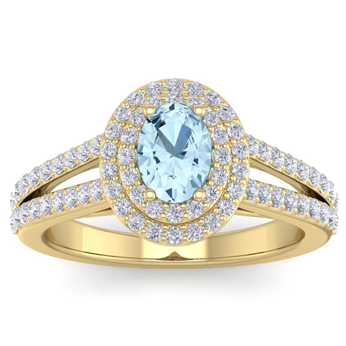This elegant gemstone ring features one 7x5mm oval shape aquamarine gemstone at approximately 0.80 carats. It is surrounded by 76 sparkling diamonds in a double halo in I-J color, I1-I2 clarity at 1 carat total weight. Total gem weight is approximately 1.80 carat total weight. This ring is in 14 karat yellow gold. Ring top measures 10x8mm.