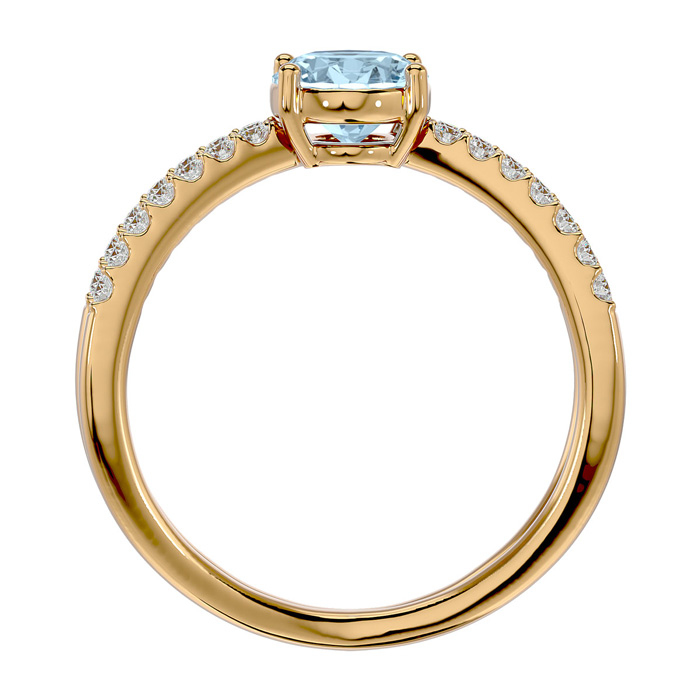 This elegant gemstone ring features one 8x6mm oval shape aquamarine gemstone at approximately 1.15 carats. It is surrounded by 28 sparkling diamonds in I-J color, I1-I2 clarity at 1/4 carat total weight. Total gem weight is approximately 1.40 carats. This ring is in 14 karat yellow gold.