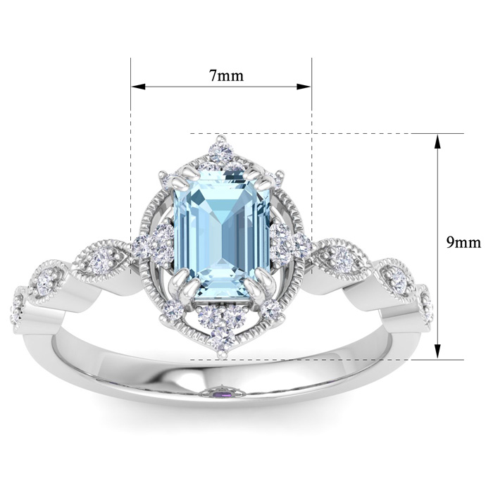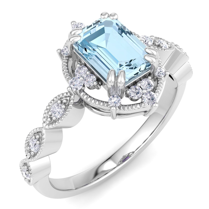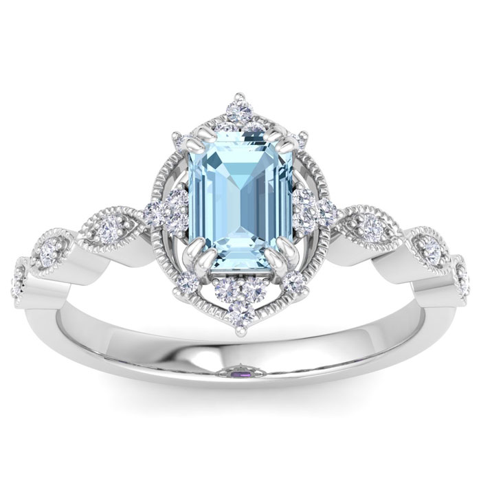 This gemstone ring features one 7x5mm octagon shape aquamarine gemstone weighing approximately 3/4 carat. There are 22 sparkling round diamonds in I-J color, I1-I2 clarity totaling approximately 1/4 carat. Total carat weight is 1 carat. This ring is in 14 karat white gold.