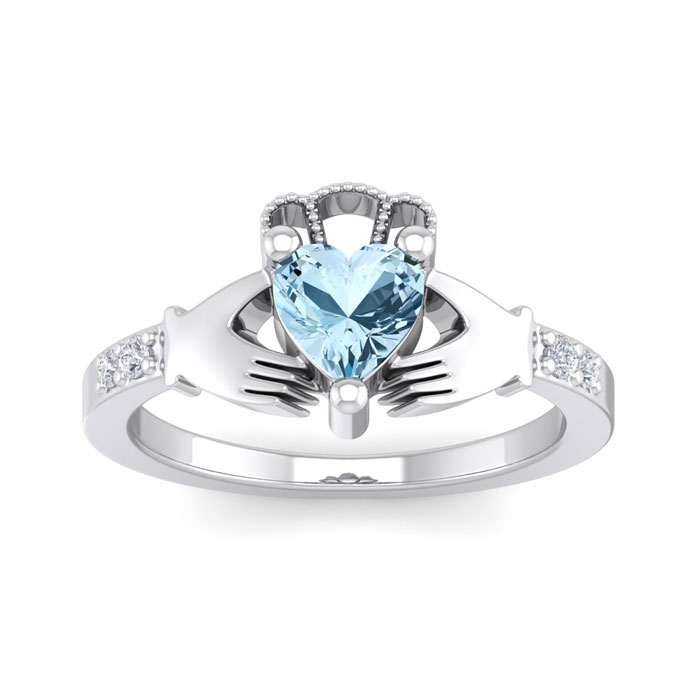 1 Carat Heart Shape Aquamarine and Diamond Claddagh Ring In Sterling Silver