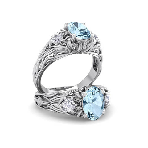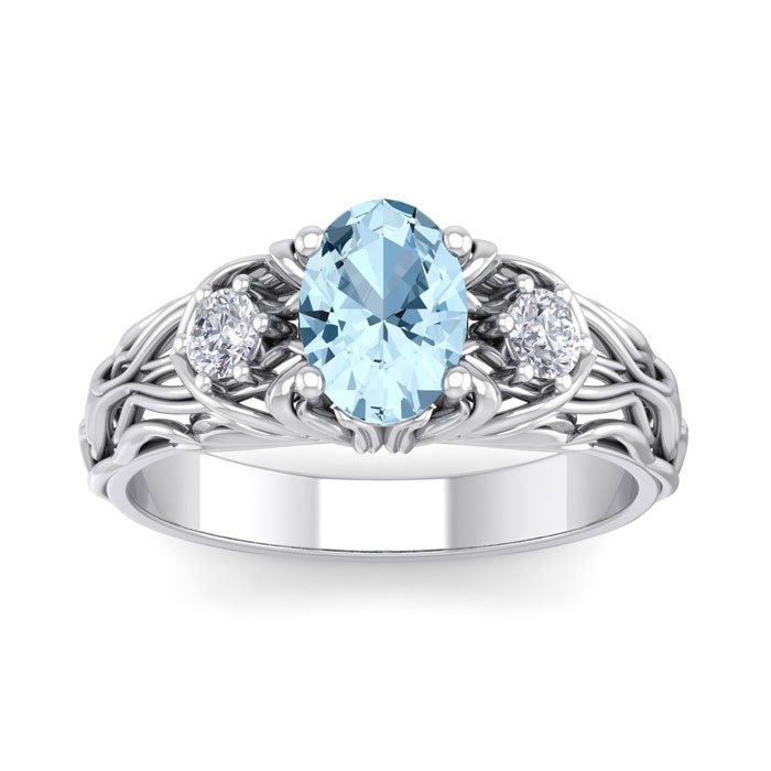 1 Carat Oval Shape Aquamarine and Diamond Intricate Vine Engagement Ring In 14 Karat White Gold