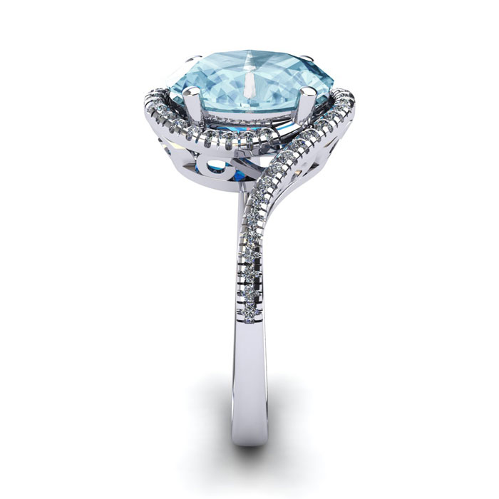 This stunning gemstone and halo diamond ring features one 7x5mm oval shape aquamarine gemstone at 0.80 carats. It is surrounded by 46 sparkling diamonds in a halo and down the band in H-I color, I1-I2 clarity at 0.23 carats. Total gem weight is 1.03 carats. This ring is crafted in 14 karat white gold.