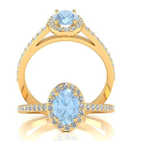 1 Carat Oval Shape Aquamarine and Halo Diamond Ring In 14 Karat Yellow Gold