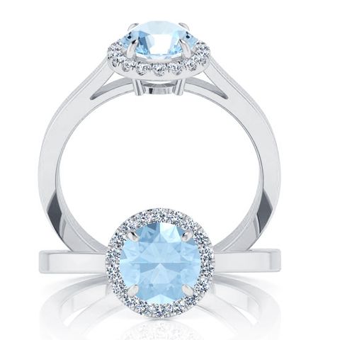 This stunning gemstone and halo diamond ring features one 6mm round shape aquamarine gemstone at 0.80 carats. It is surrounded by 18 sparkling diamonds in a halo in H-I color, I1-I2 clarity at 0.09 carats. Total gem weight is 0.89 carats. This ring is crafted in 14 karat white gold.