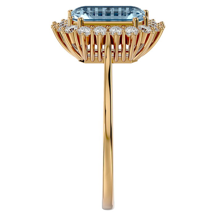 This stunning gemstone and diamond ring features one 9x7mm emerald cut aquamarine gemstone at 2.15 carats. It is surrounded by 18 sparkling diamonds in I-J color, I1-I2 clarity at 1/3 carat. Total gem weight is approximately 2 1/2 carats. This ring is crafted in 14 karat yellow gold.