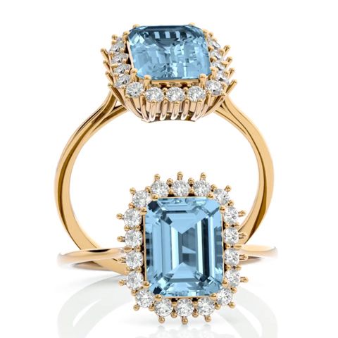 This stunning gemstone and diamond ring features one 9x7mm emerald cut aquamarine gemstone at 2.15 carats. It is surrounded by 18 sparkling diamonds in I-J color, I1-I2 clarity at 1/3 carat. Total gem weight is approximately 2 1/2 carats. This ring is crafted in 14 karat yellow gold.
