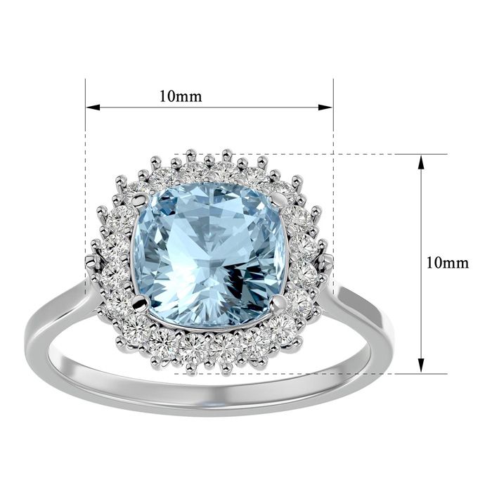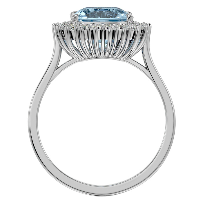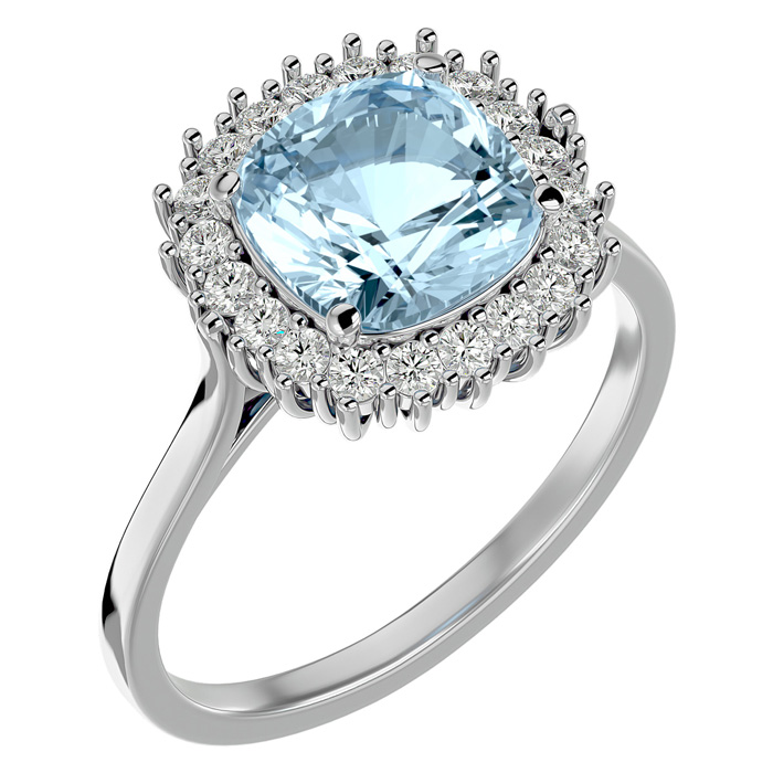 Retrograde Birthstones™ 2 1/2 Carat Cushion Cut Aquamarine and Halo Diamond Ring In 14K White Gold