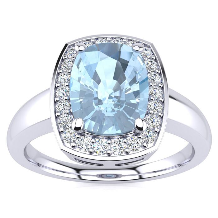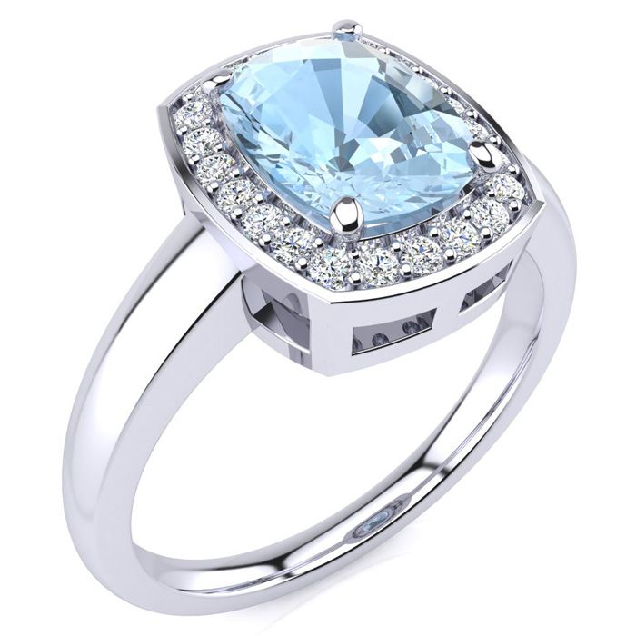 This stunning gemstone and diamond ring features one 9x7mm cushion shape aquamarine gemstone at 2.15 carats. It is surrounded by 22 sparkling diamonds in I-J color, I1-I2 clarity at 0.15 carats. Total gem weight is 2.30 carats. This ring is crafted in 14 karat white gold.