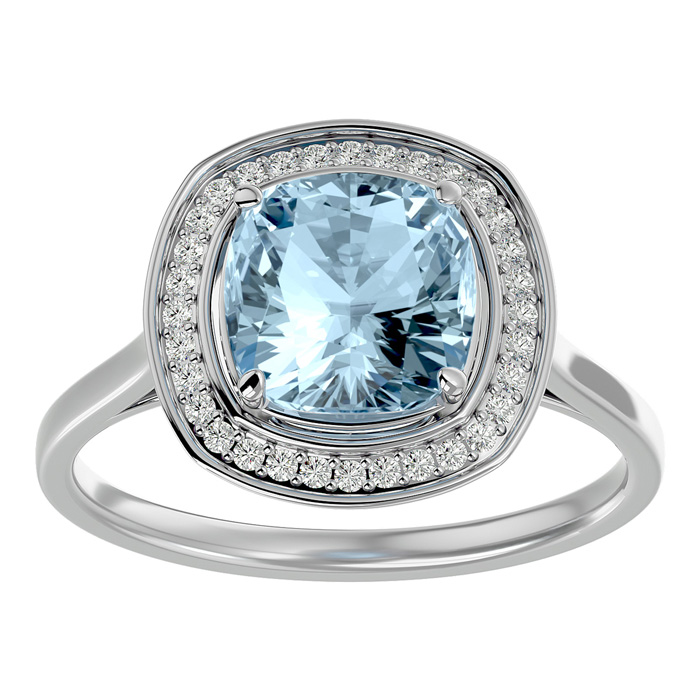 This stunning gemstone and diamond ring features one 8x8mm cushion cut aquamarine gemstone at 2.10 carats. It is surrounded by 32 sparkling diamonds in I-J color, I1-I2 clarity at 0.16 carats. Total gem weight is approximately 2 1/4 carats. This ring is crafted in 14 karat white gold.
