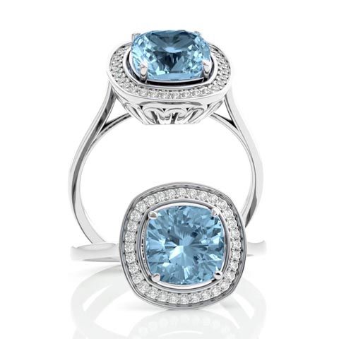 2 1/4 Carat Cushion Cut Aquamarine and Halo Diamond Ring In 14K White Gold