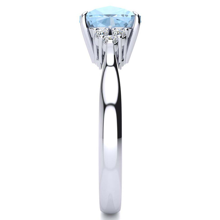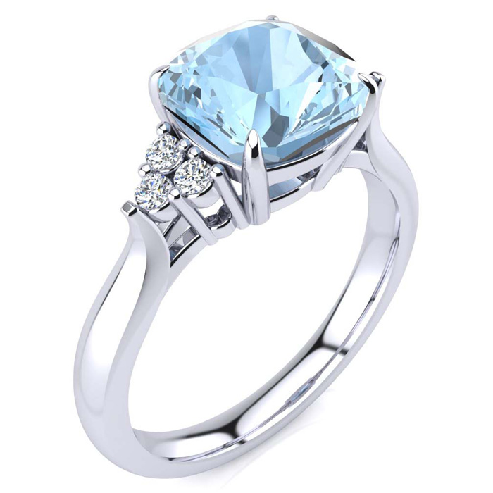 This stunning gemstone and diamond ring features one 8x8mm cushion cut aquamarine gemstone at 2.10 carats. It is surrounded by 6 sparkling diamonds in I-J color, I1-I2 clarity at 0.09 carats. Total gem weight is approximately 2.19 carats. This ring is crafted in 14 karat white gold.
