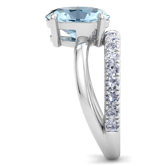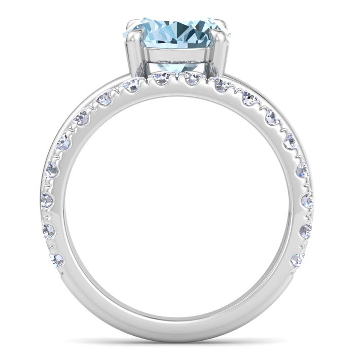 This elegant gemstone ring features one 10x8mm oval shape aquamarine gemstone at approximately 2 1/4 carats. It is surrounded by 18 sparkling diamonds in I-J color, I1-I2 clarity at 1/2 carat total weight. Total gem weight is approximately 2 3/4 carats. This ring is in 14 karat white gold.