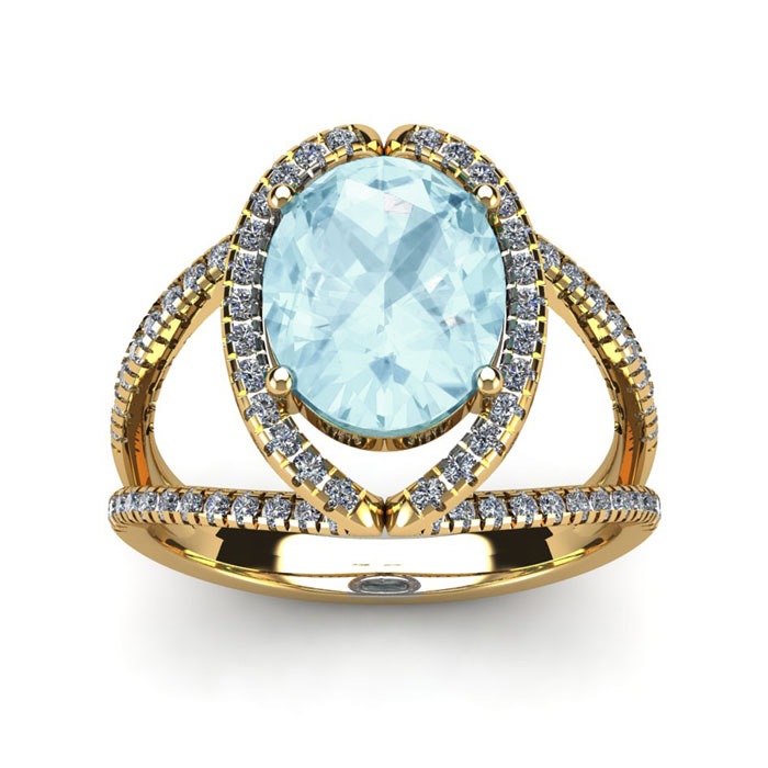 2 3/4 Carat Oval Shape Aquamarine and Halo Diamond Ring In 14 Karat Yellow Gold
