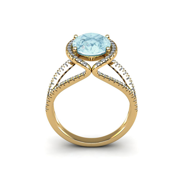 This stunning gemstone and diamond ring features one 10x8mm oval shape aquamarine gemstone at 2.25 carats. It is surrounded by 74 sparkling diamonds in a halo and down the split shank band in I-J color, I1-I2 clarity at 0.56 carats. Total gem weight is 2.81 carats. This ring is crafted in 14 karat yellow gold.