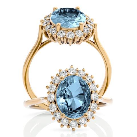 This elegant gemstone ring features one 10x8mm oval shape aquamarine gemstone at approximately 2 1/4 carats. It is surrounded by 16 sparkling diamonds in I-J color, I1-I2 clarity at 1/2 carat total weight. Total gem weight is approximately 2 3/4 carats. This ring is in 14 karat yellow gold.