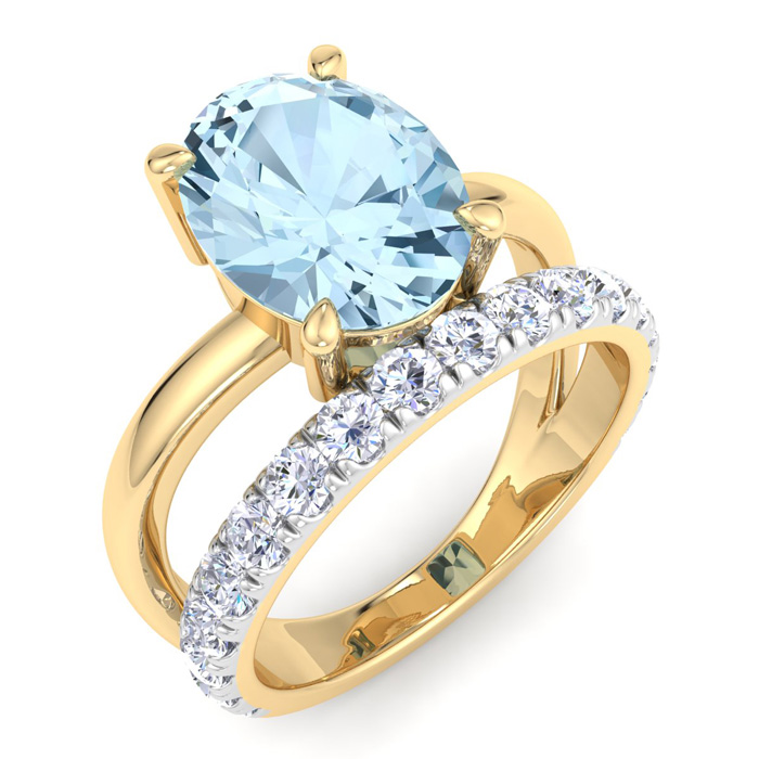 2 3/4 Carat Oval Shape Aquamarine and Halo Diamond Ring Plus Band In 14 Karat Yellow Gold