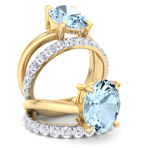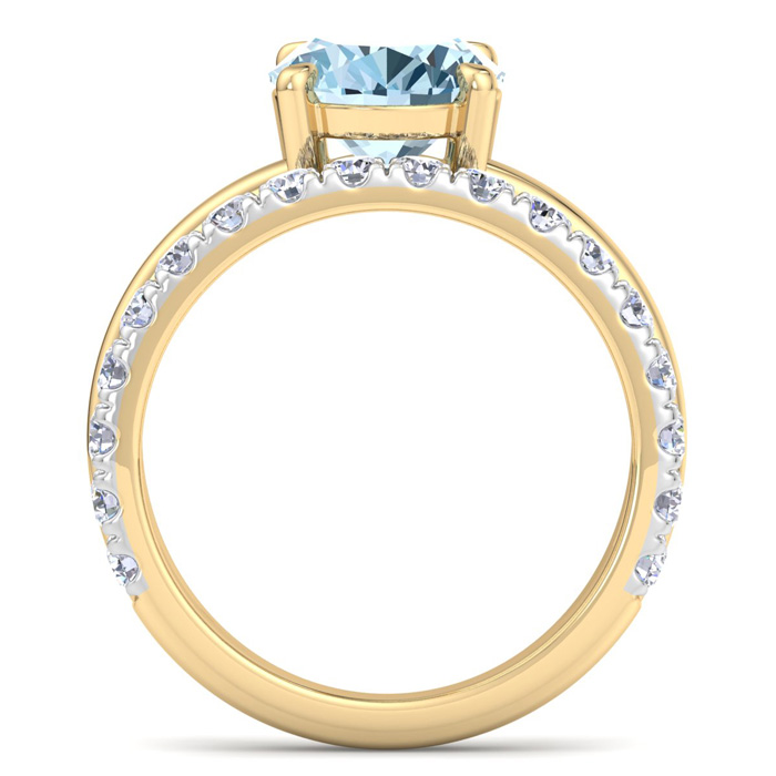 This elegant gemstone ring features one 10x8mm oval shape aquamarine gemstone at approximately 2 1/4 carats. It is surrounded by 18 sparkling diamonds in I-J color, I1-I2 clarity at 1/2 carat total weight. Total gem weight is approximately 2 3/4 carats. This ring is in 14 karat yellow gold.