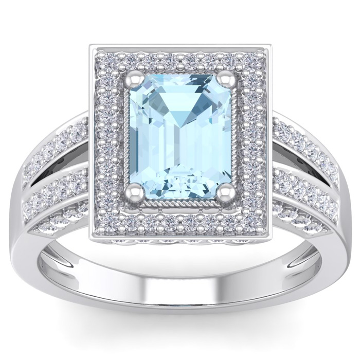 This elegant gemstone and diamond ring features one 8x6mm emerald cut aquamarine gemstone at approximately 1.40 carats. It is surrounded by 80 sparkling diamonds in I-J color, I1-I2 clarity at 2/3 carat total weight. Total gem weight is approximately 2 carats. This ring is in 14 karat white gold.