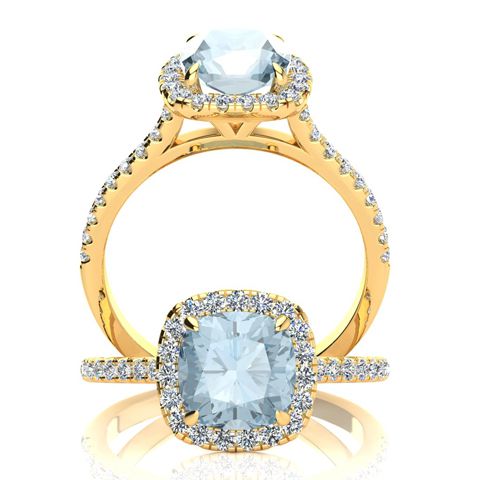 2 Carat Cushion Cut Aquamarine and Halo Diamond Ring In 14K Yellow Gold