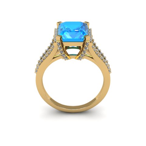 This stunning gemstone and diamond ring features one 10x8mm emerald cut aquamarine gemstone at 3 3/4 carats. It is surrounded by 72 sparkling diamonds in a halo and down the band in I-J color, I1-I2 clarity at 1/2 carat. Total gem weight is 4 carats. This ring is crafted in 14 karat yellow gold.