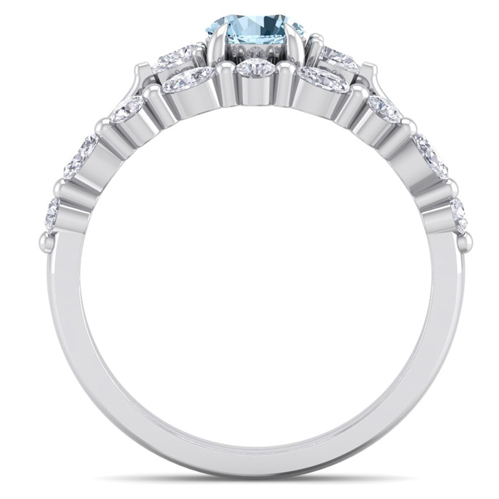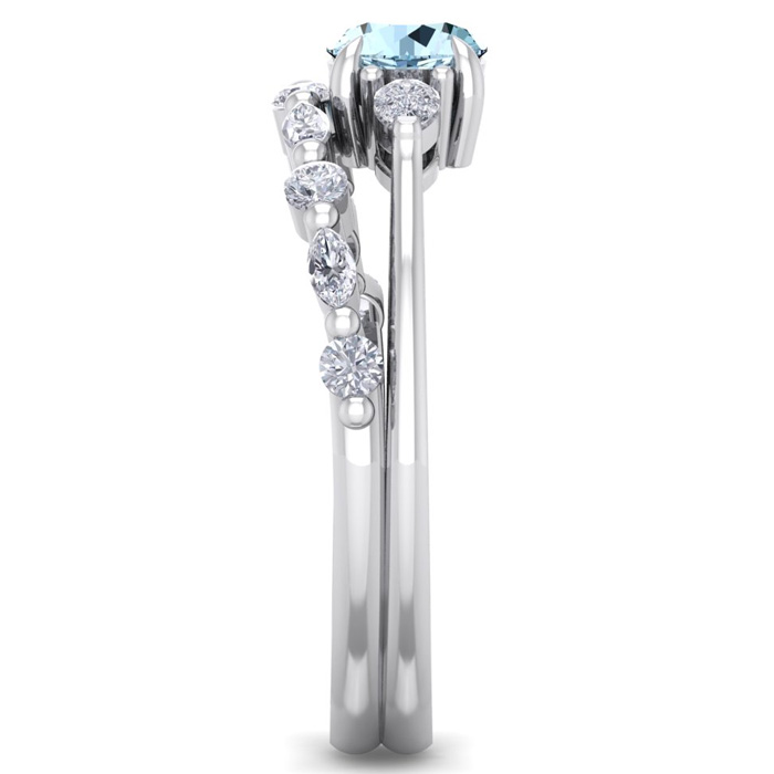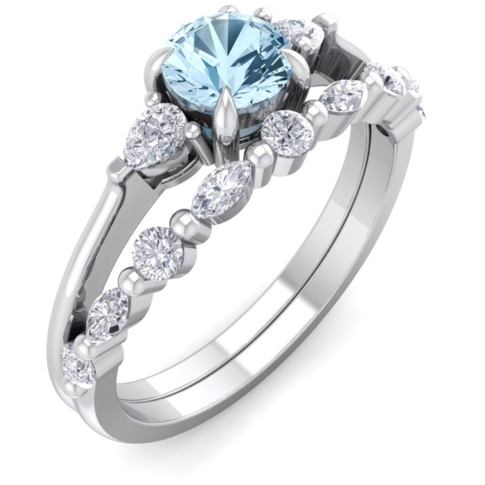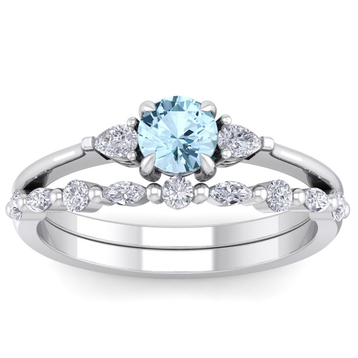 This elegant gemstone bridal set features one 5mm round shape aquamarine gemstone at approximately 0.50 carats. It is surrounded by 5 round, 4 marquise and 2 pear shape sparkling diamonds along the ring and matching band in I-J color, I1-I2 clarity at 1/3 carat total weight. Total gem weight is approximately 0.86 carat total weight. This ring is in 14 karat white gold.