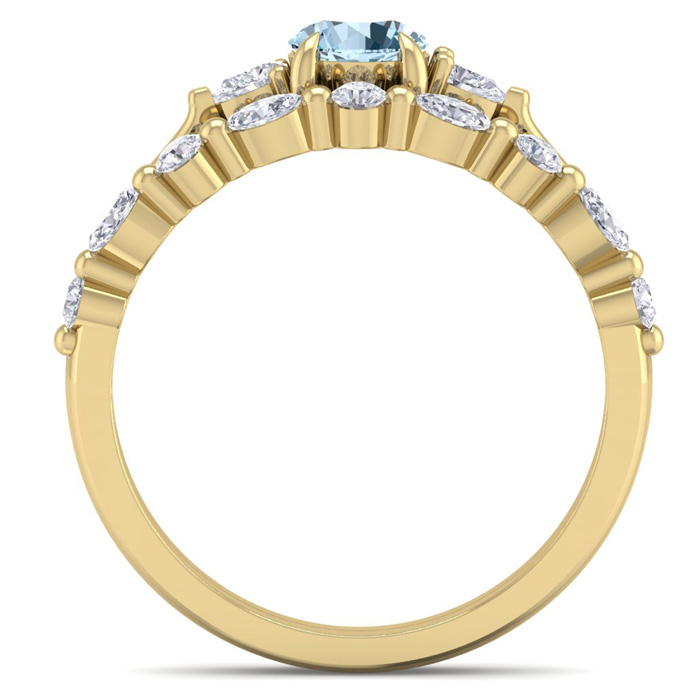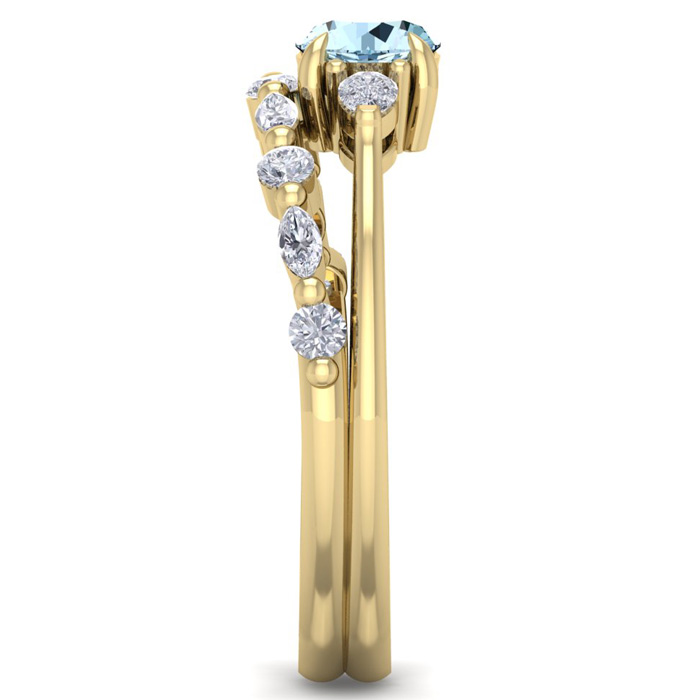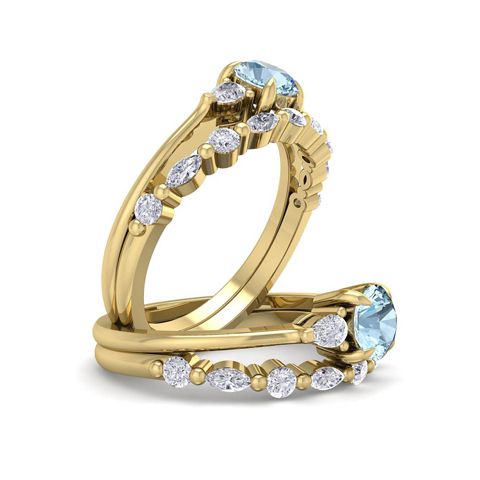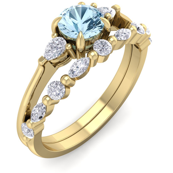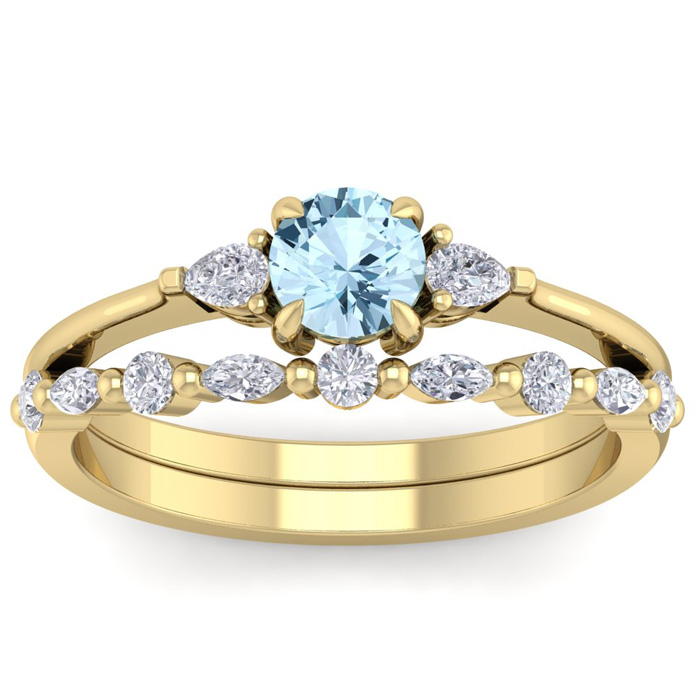 This elegant gemstone bridal set features one 5mm round shape aquamarine gemstone at approximately 0.50 carats. It is surrounded by 5 round, 4 marquise and 2 pear shape sparkling diamonds along the ring and matching band in I-J color, I1-I2 clarity at 1/3 carat total weight. Total gem weight is approximately 0.86 carat total weight. This ring is in 14 karat yellow gold.