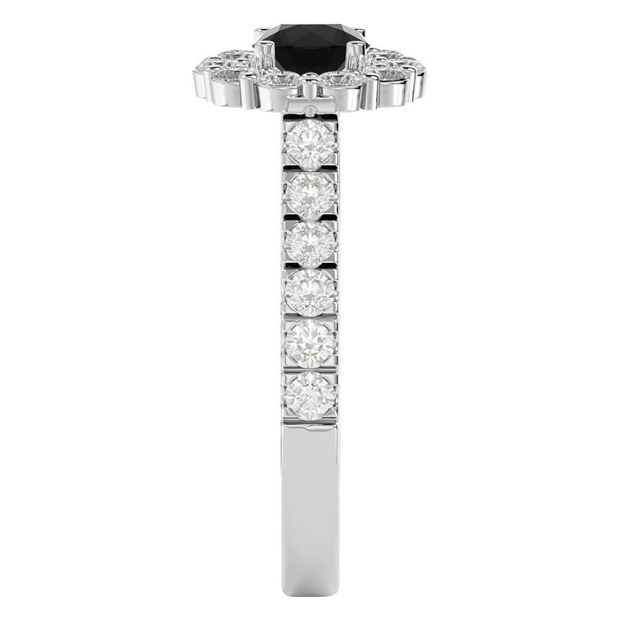 This fabulous diamond engagement ring features a sparkling 1/2 carat round shape center black diamond in I3 clarity. It is surrounded by 22 side diamonds totaling 1 carat. Total carat weight is 1 1/2 carats. This ring is in 14 karat white gold.