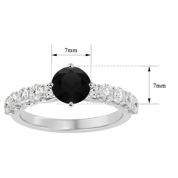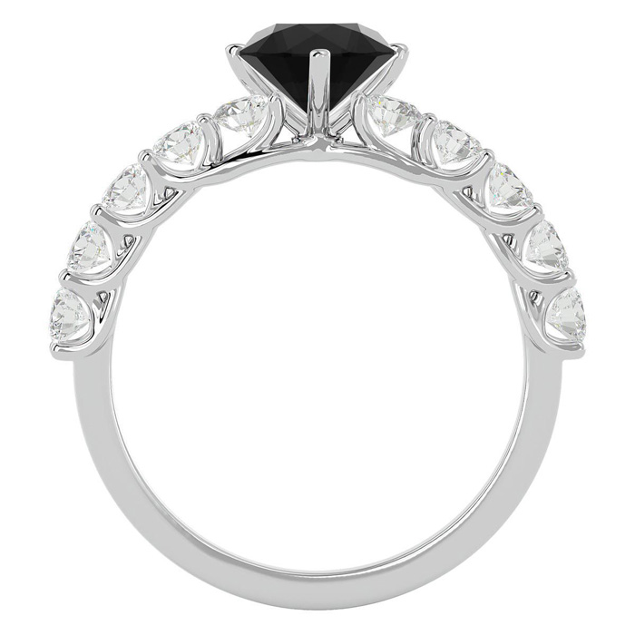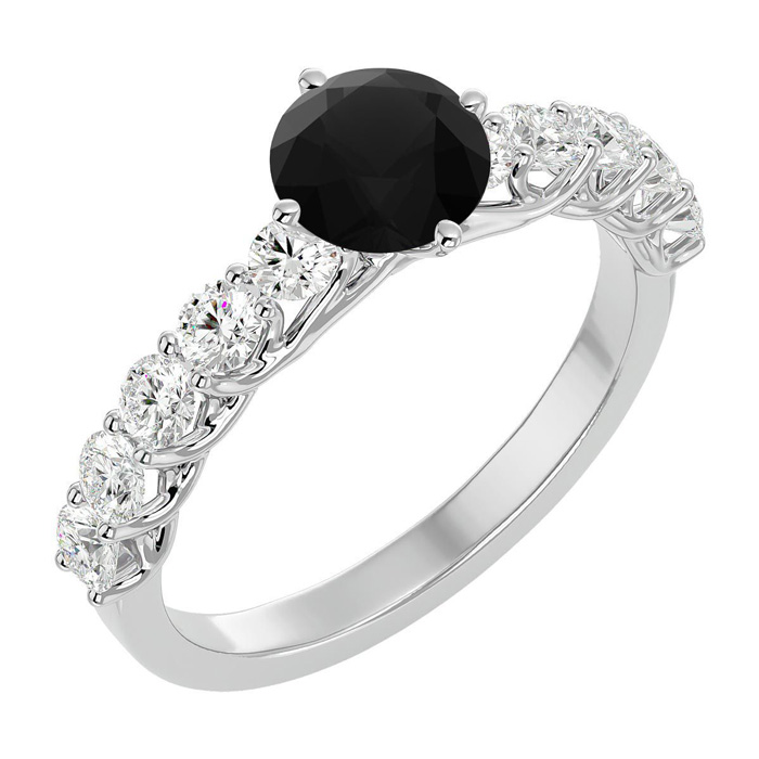 This fabulous diamond engagement ring features a sparkling 1 carat round shape center black diamond in I3 clarity. It is surrounded by 10 side diamonds totaling 3/4 carat. Total carat weight is 1 3/4 carats. This ring is in 14 karat white gold.