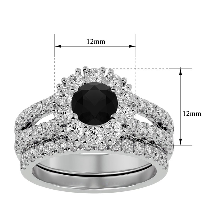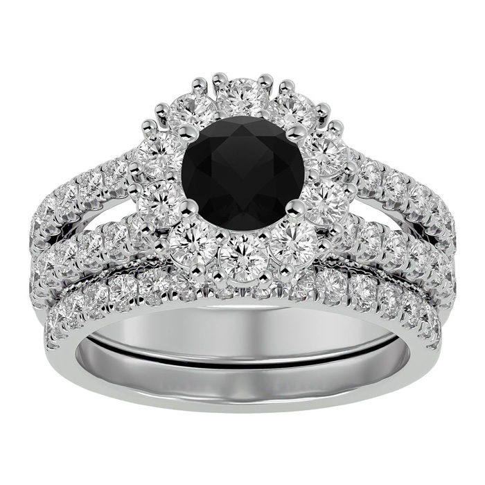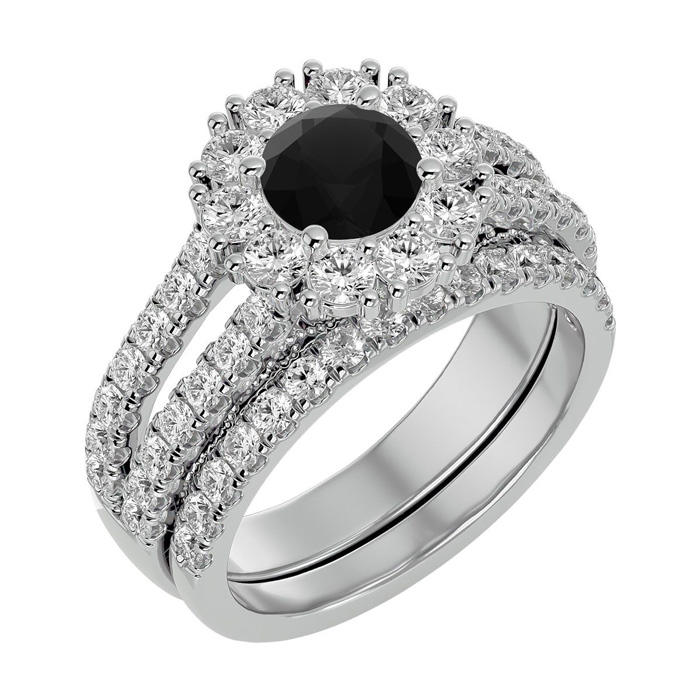 This fabulous diamond bridal set features a sparkling 1 carat round shape center black diamond in I3 clarity. It is surrounded by a halo of 54 side diamonds between the ring and band totaling 1 1/2 carats. Total carat weight is 2 1/2 carats. This ring is in 14 karat white gold.