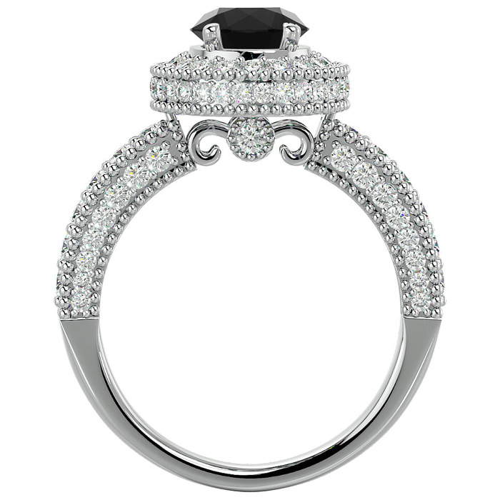 This fabulous diamond engagement ring features a sparkling 1 carat center black diamond in I3 clarity. It is surrounded by a halo of 153 side diamonds totaling 1 1/2 carats. Total carat weight is 2 1/2 carats. This ring is in 14 karat white gold.