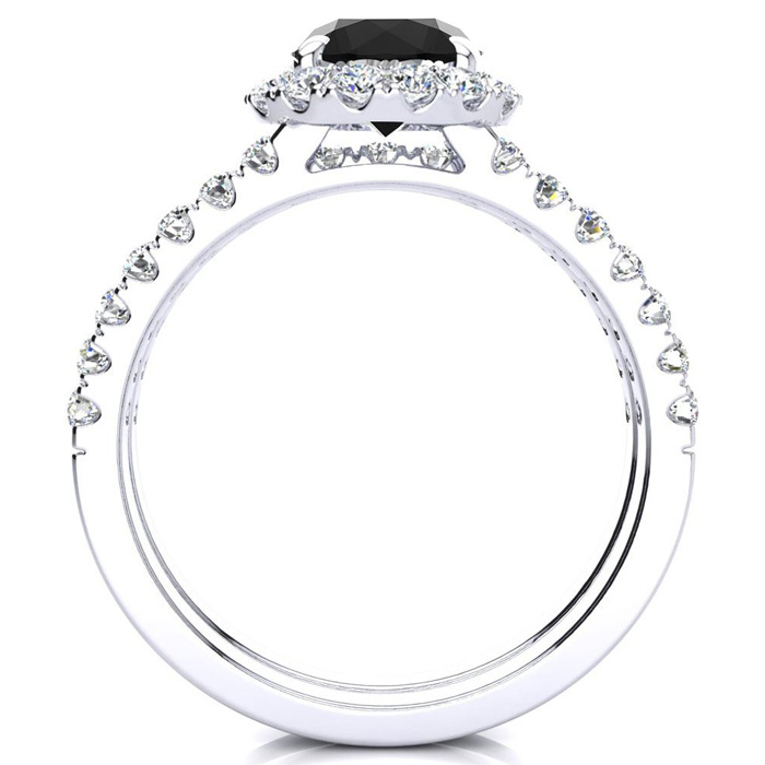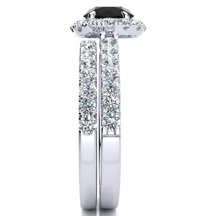 This bridal set features a sparkling 1 carat center black diamond in I3 clarity. It is accented with 46 side diamonds in a halo and along the bands at 1 carat. Total carat weight is approximately 2 carats. This ring is in 14 karat white gold.